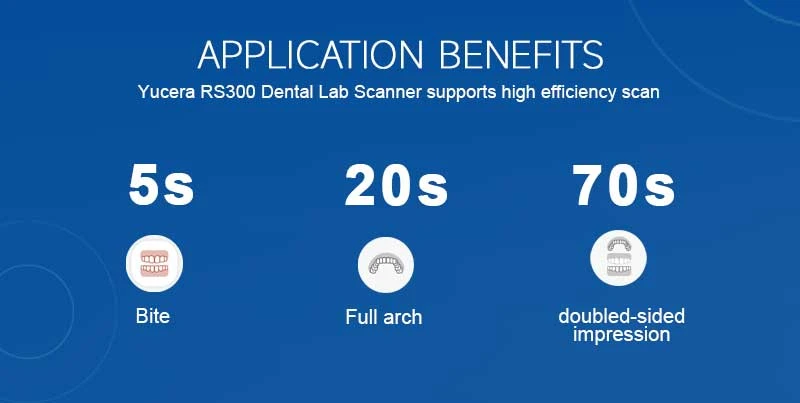Стоматологический лабораторный сканер Yucera RS300 поддерживает высокоэффективное сканирование: 5 секунд для окклюзионного соотношения и 20 секунд для сканирования всей дуги.
