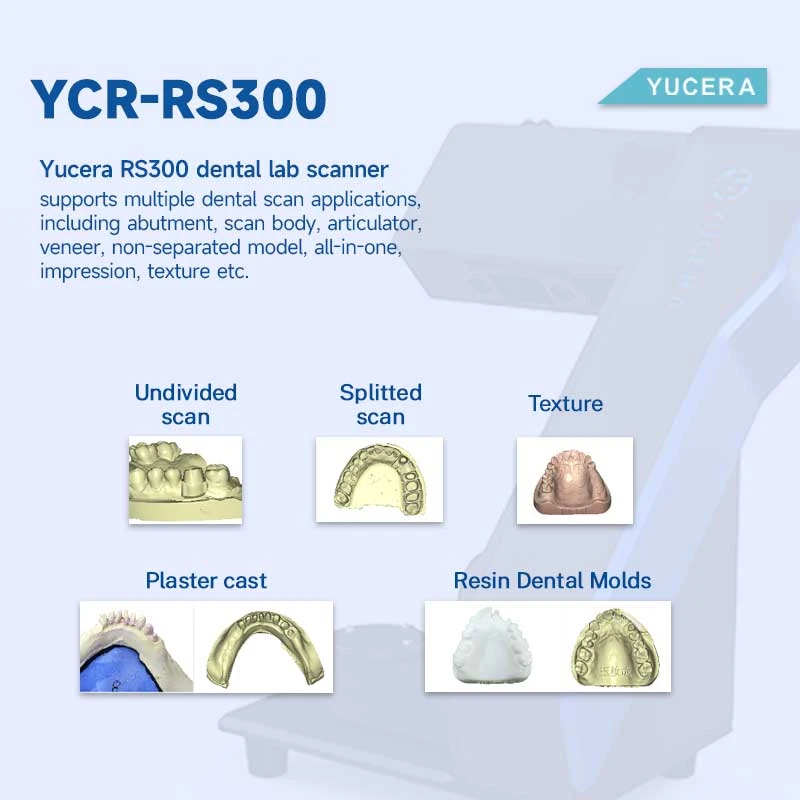 Стоматологический лабораторный сканер Yucera RS300 поддерживает различные приложения стоматологического сканирования, включая абатменты, скан-корпуса, артикулятор, виниры, неразделенные модели, модели «все в одном», оттиски, текстуры и т. д.